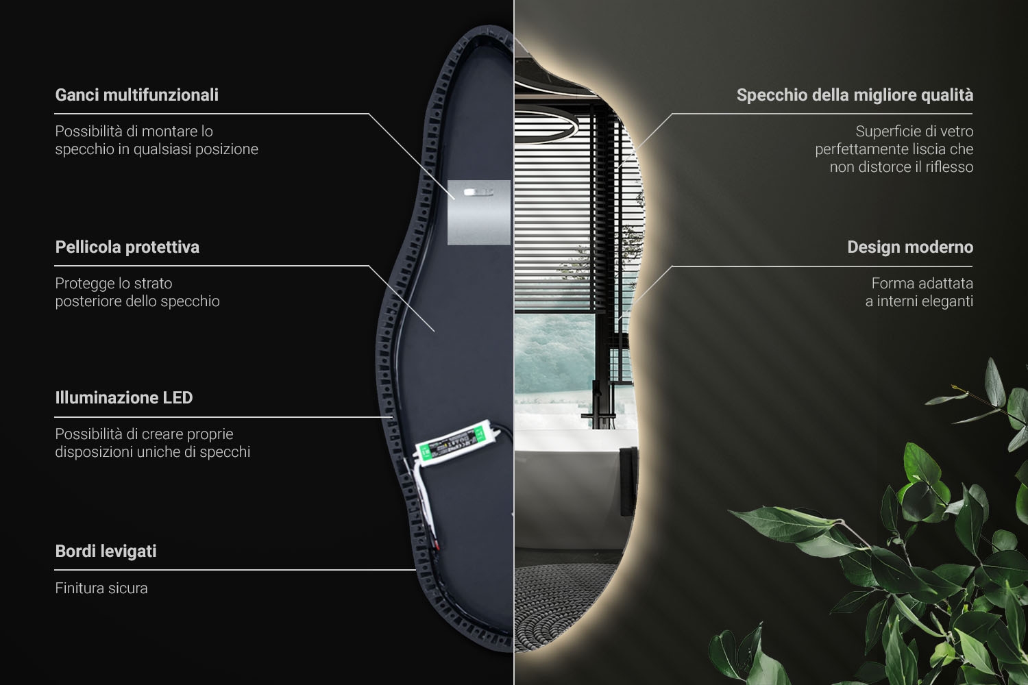 Se cerchi uno specchio originale che combini funzionalità, illuminazione intelligente e uno stile distintivo, questo specchio forma organica illuminato è la scelta perfetta per dare nuova vita ai tuoi ambienti con un tocco di eleganza contemporanea.