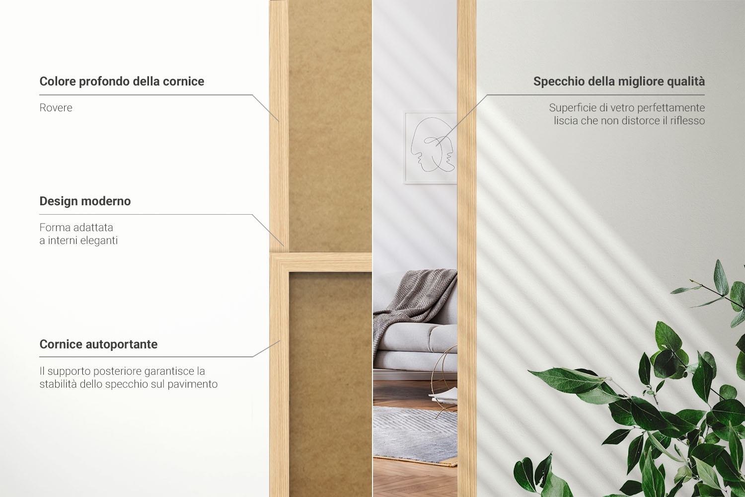 Adotta l'estetica calda e naturale del legno di rovere con un design pratico e resistente! Specchio da terra con cornice colore quercia combina l'aspetto autentico con la moderna durabilità. Questo specchio da terra cornice rovere si distingue per la sua finitura che imita fedelmente la venatura del legno, portando un tocco di natura e accoglienza in casa. È l'ideale per stili come lo scandinavo o il rustico. Lo specchio in piedi legno rovere (con finitura effetto rovere) è stabile e non richiede installazione. Sia che lo chiami specchio da pavimento quercia o specchio cornice legno di rovere, offre un'estetica ricca senza le esigenze di manutenzione del legno massello. Un specchio da terra in rovere versatile e di grande impatto visivo.