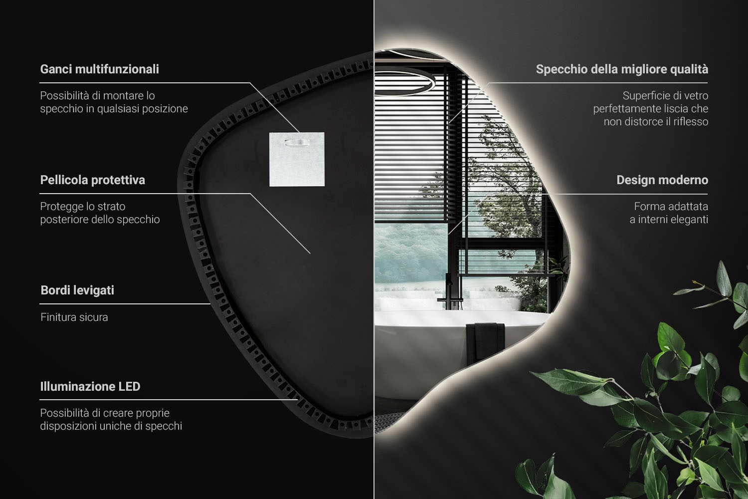 Dai vita al tuo ambiente con un accento unico che attirerà subito l'attenzione. Specchio macchia con illuminazione LED unico è un elemento decorativo moderno che si distingue per la sua forma insolita. La sua forma unica porta freschezza e carattere artistico in ogni spazio. Un elemento che diventa facilmente il punto focale di ogni stanza – dal soggiorno, alla camera da letto, fino al bagno elegante.